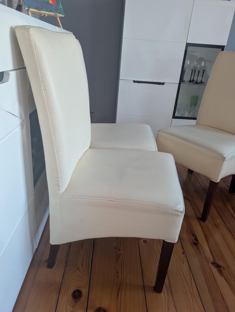 Sprzedam używane krzesła, 8 sztuk, kremowe, nie są porwane lecz posiadają widoczne zabrudzenia.